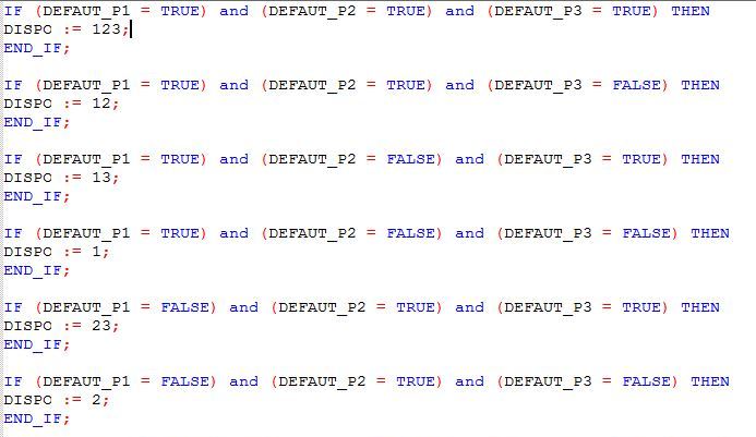 Si DéfautPompe1 = 1 ET DéfautPompe 2 = 1 ET DéfautPompe 3 = 1 alors DISPO = 123 (Cas idéal, toutes les pompes sont en service)