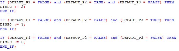 Si DéfautPompe1 = 0 ET DéfautPompe 2 = 1 ET DéfautPompe 3 = 1 alors DISPO = 23 (2 pompes slt en service).