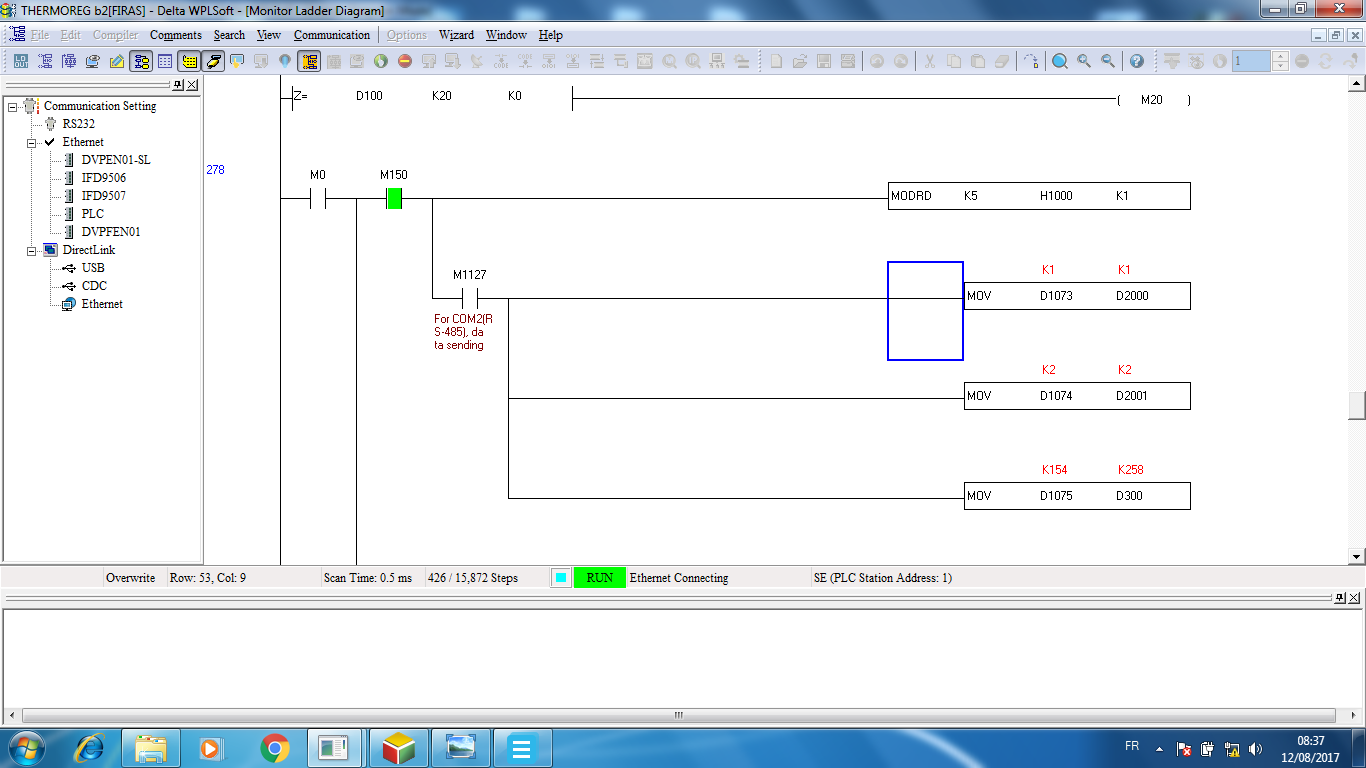 J'ai assuré l’émission (consigne température) et la réception (lecture mesure) des données entre automate delta SE12 et 10 thermorégulateurs (delta dtk) a travers de réseau profibus, mais j'ai trouve un problème dans une situation de lecture de mesure. Pour la lecture de la mesure j'utilise un bit M1127 (for com2 (rs485),data sending/receiving/converting completed). ce bit M1127 est activé lorsque on a une communication entre PLC DELTA et les thermorégulateurs.