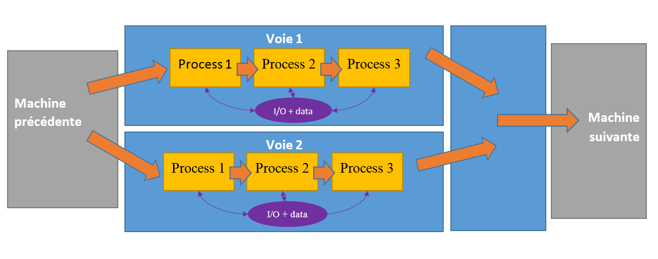 - Les produits passent sur deux voies, qui effectuent chacune 3 opérations. La logique de chaque process est la même, seul les E/S changent en fonction de la voie.