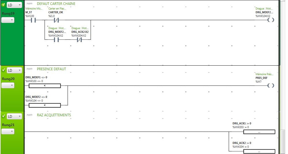 Je ne voit aucun moyen de pointer sur ces bits dans Vijeo donc je passe par un tableau de booléen et là ça marche. Sauf que je voudrai pouvoir remettre a zéro facilement mes alarmes sur un BP d'acquittement par exemple et la je n'arrive tout simplement pas à trouver une instruction de copie d'un mot dans un tableau comme un MOVE_INT_AREBOOL en Unity pour remettre tous les bits à zéro ou du moins une fonction qui me permettrai d'arriver à ce résultat. Bref est ce que quelqu'un qui connait bien Somachine pourrait me dire dans quelle direction partir pour une faire une gestion d'alarmes toute simple dans Somachine ? Merci.