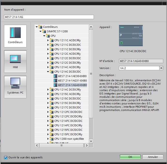 Avec le catalogue que tu m'as fait part, il n'y a pas la version 4.2 du firmware. Je suis en train de télécharger la version trial de TIA V14, on verra bien si ça règle le soucis (Ça m'a l'air quand même beaucoup moins intuitif que sur Unity pro, sans doute une question d'habitude)