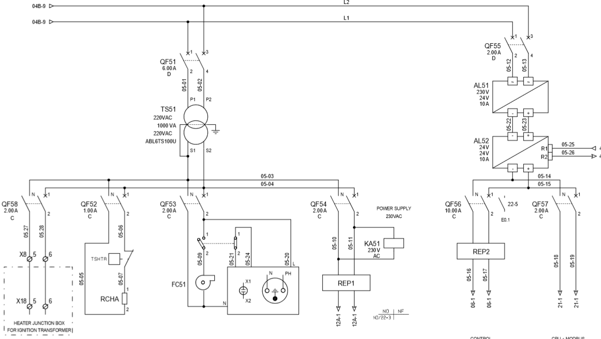 Si besoin : En aval du transfo d'isolement, on trouve juste une boite de jonction, une résistance chauffante (système anti-condensation), un éclairage avec un ventilo puis un boitier de détecteur de flamme.