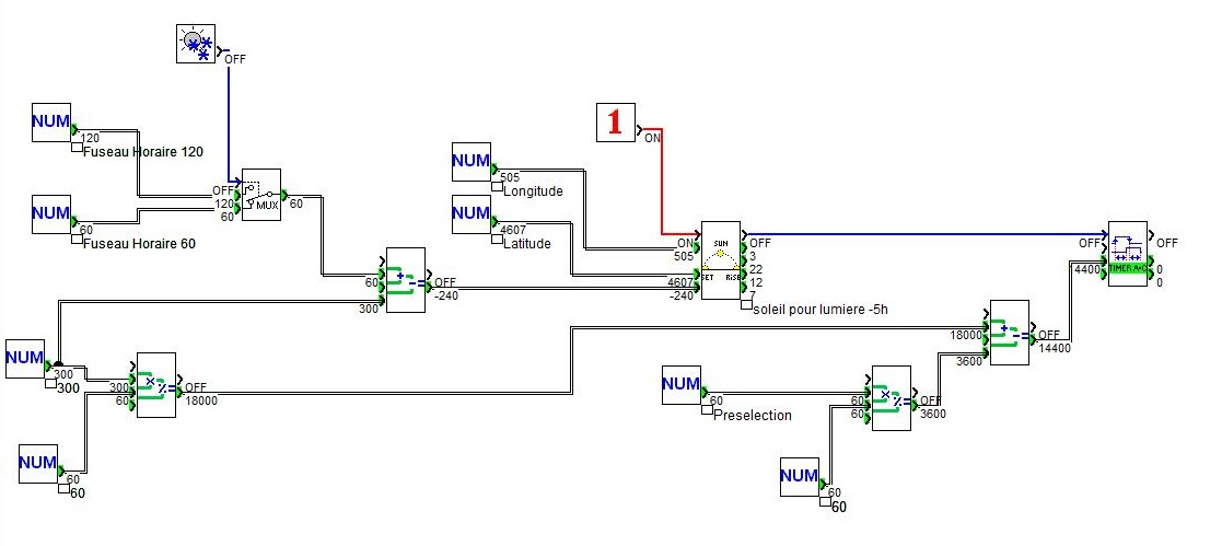 J'ai intégré ça, pas de problème. Le truc c'est quand tu décales les heures pour lever de soleil + 1h et coucher - 1h par exemple. Dans ce cas, il faut comparer avec l'heure courante. Du coup, j'ai testé le nouveau logiciel du millenium. L'heure courante est dispo. J'ai trouvé une bizarrerie, à savoir un bloc de conversion h:mn en mn, qui sort ce qu'on rentre sous la même forme.
