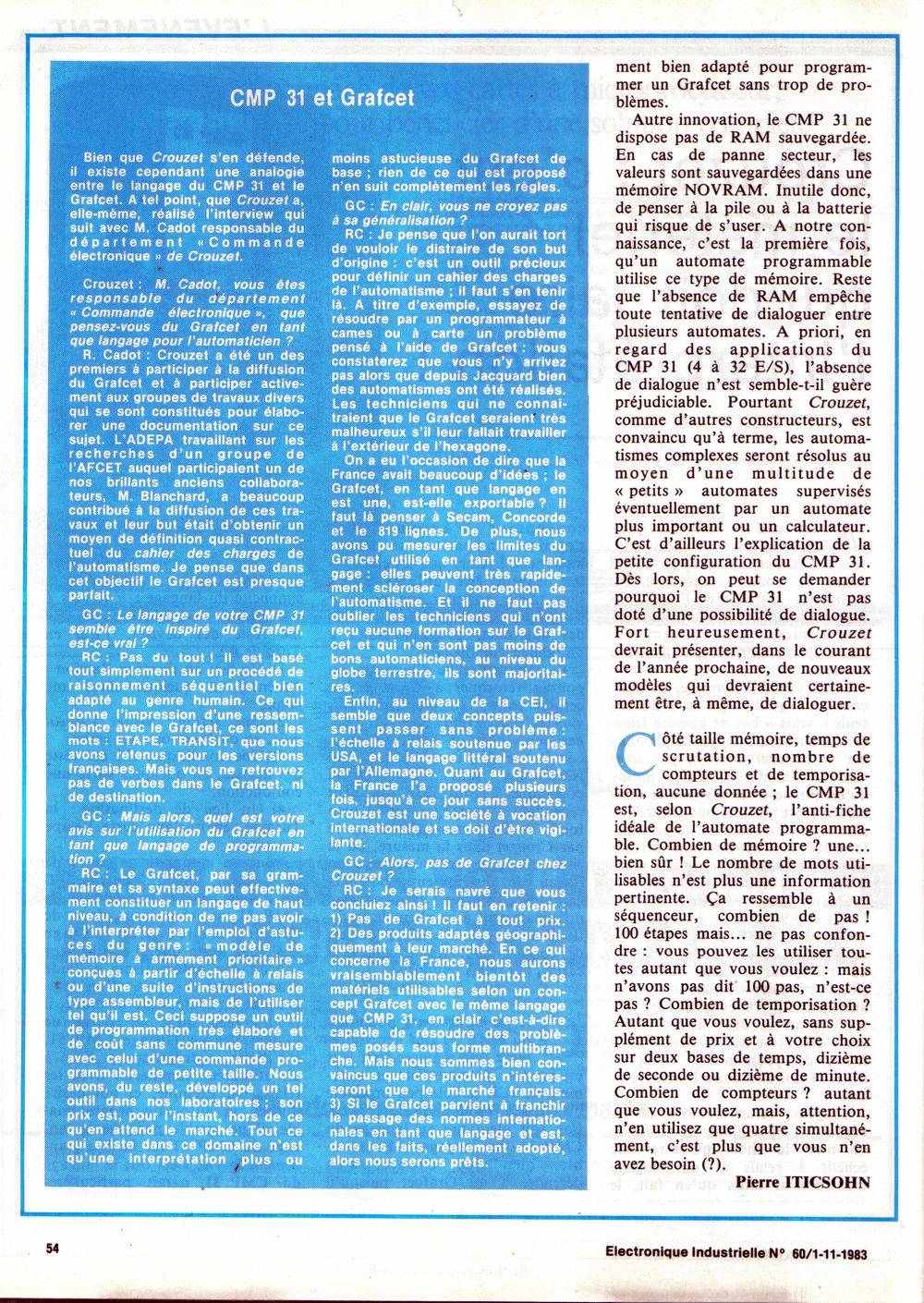 Deux articles sur les automates Crouzet CMP31 provenant de la revue Electronique Industrielle.