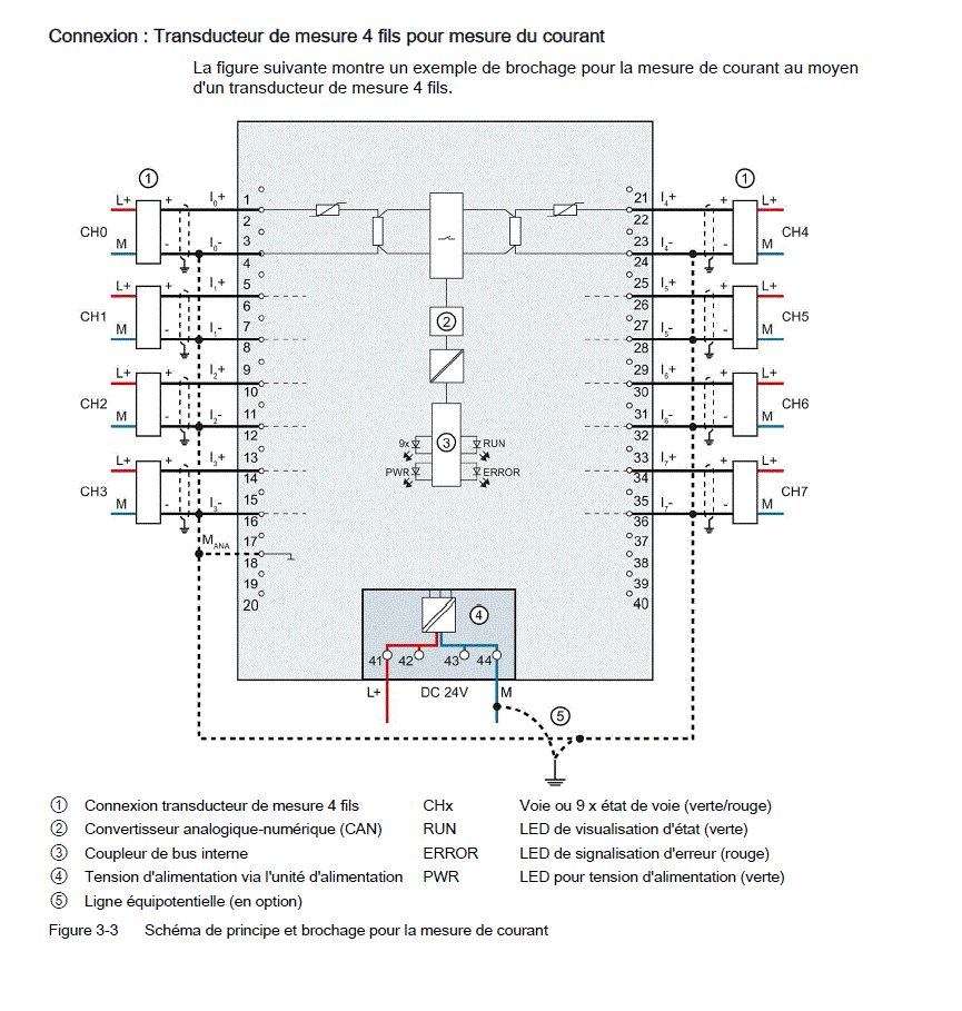 Cablage : du + vdc du debimetre vers Loop+ du debimetre , puis du loop - vers l entrer analog + , et la masse relié a -VDC du debimetre.