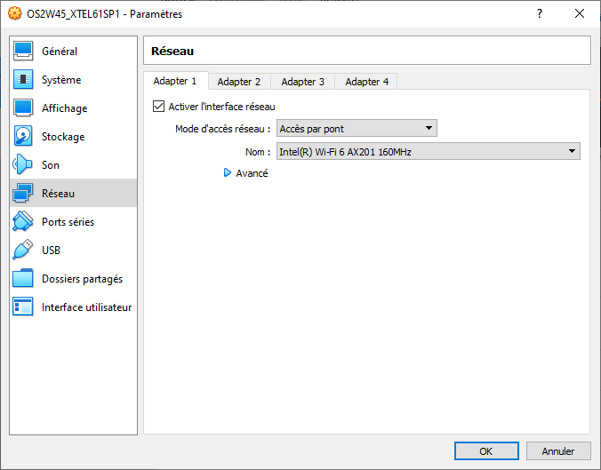 Dans la catégorie "Réseau", choisis "Accès par pont", le nom de la carte réseau sera surement different, c'est normal