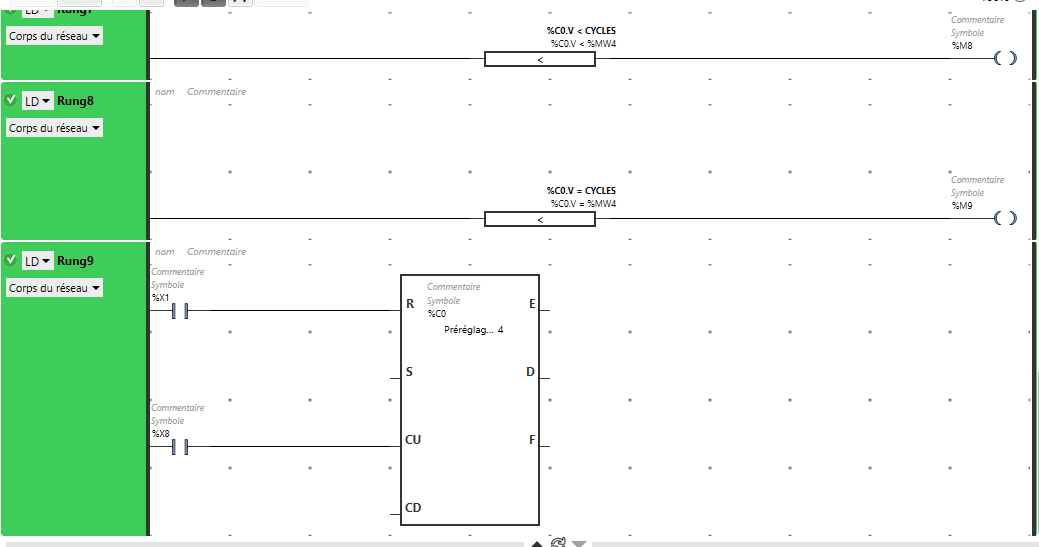 je pense que le problème vient pas de %X8 , qui est en faite, une étape du grafcet, dans laquelle le compteur s'incrémente, mais c'est dans le contact qui resete le compteur, qui doit être normalement vrais et il reste vrai dès que la valeur actuelle ''%C0.v" est identique à celle de nombre de cycle ''%MW4", pour empêcher le compteur de s'incrémenter à nouveau.