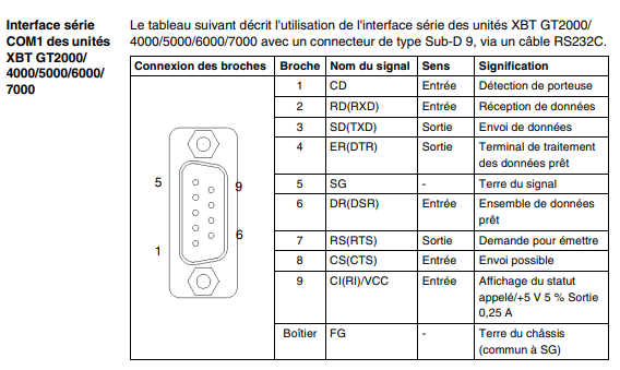 Merci, pour la configuration du pilote tout me semble ok mais après analyse je n’ai pas le câble XBt Z9731 en stock et ça m’intéresse à pouvoir le concevoir moi-même mais sur ce câble de liaison entre l’ihm et le câble c’est une liaison rs 232c et en sortie du câble c’est un connecteur 25 pins alors que mon automate et un 9 pins donc je ne vais pas pouvoir me référer au schéma de ce câble.