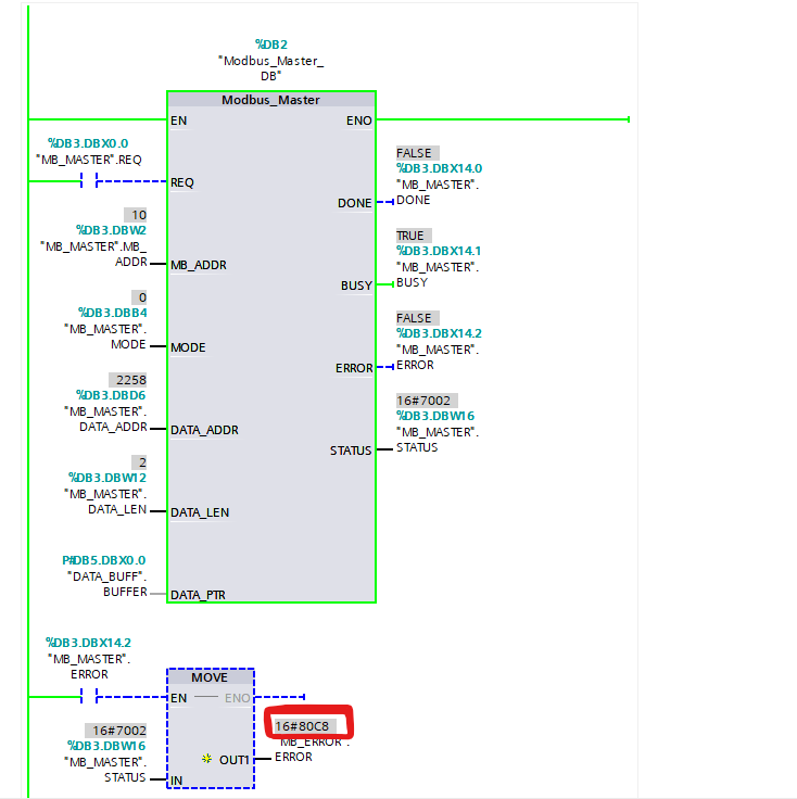 J'ai configuré mon "Modbus_Comm_Load" et mon "Modbus_Master" correctement (je pense), lorsque je lance mon programme le "Modbus_Comm_Load" passe à "DONE" mais le "Modbus_Master" a un code d'erreur 16#80C8 (ce qui signifie --> L'esclave ne répond pas dans le temps imparti (Vérifier la vitesse de transmission, la parité et le câblage).