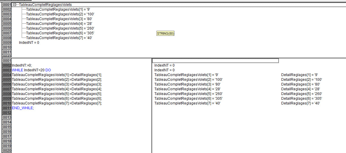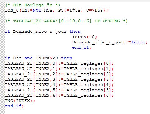 Chacune des lignes de "TableauCompletReglagesVolets" sera remplie tour à tour par les 7 valeurs émises toutes les 5 secondes par "DetailReglages" (cf fichier joint).