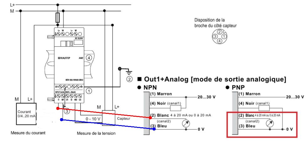 Niveau câblage la sortie semble en deux fils donc je dirai qu'il raccorder la borne 1 coté M12 au 24vdc, la borne 2 sur la borne "I" de l'extension AM2 et la 3 sur "M".