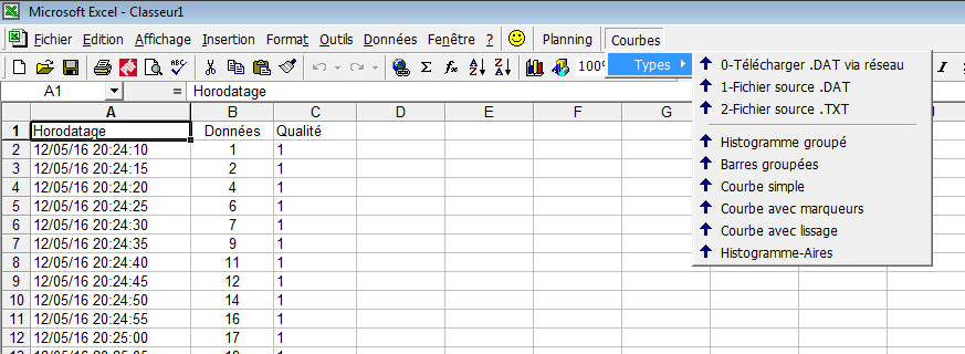 - Ouvrir Excel et cliquer sur Menu/Courbes, faire les étapes 1,2,3