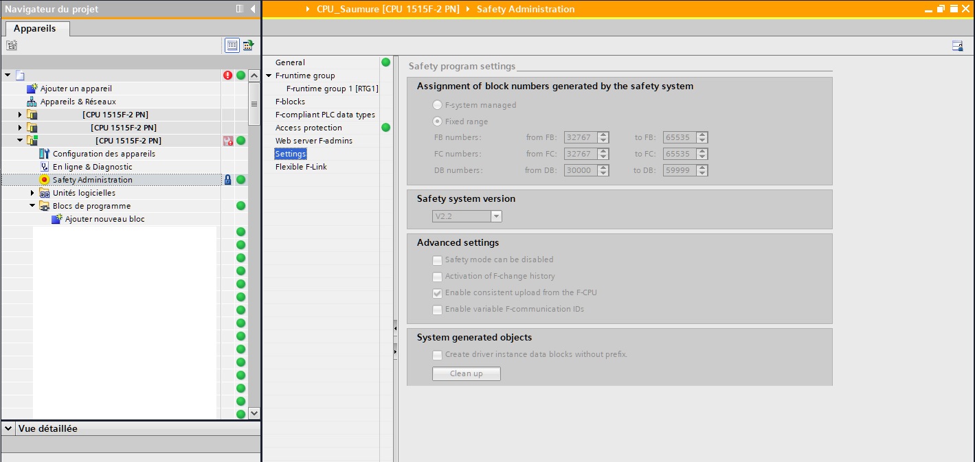 Bonjour, j'ai un problème pour effectuer des modifications sur le CPU 1512SP. Dans mon projet, j'ai accès à deux CPU 1512SP et un HMI. J'ai sur ma console Simatic le projet à jour fourni par l'intégrateur. Lorsque je me connecte, j'ai bien tous les ronds verts sur la colonne de droite. Sur les deux CPU, il y en a un avec lequel je ne peux plus envoyer de modifications, alors qu'avec l'autre, c'est possible. J'ai l'impression que cela provient de la signature safety, mais je n'ai pas suffisamment d'expérience sur TIA Portal. Lorsque j'essaie d'envoyer une modification dans la CPU, TIA Portal me renvoie le message d'erreur suivant : "The F-block will not be loaded because the safety program is not consistent" alors que je ne touche pas au programme de securité.