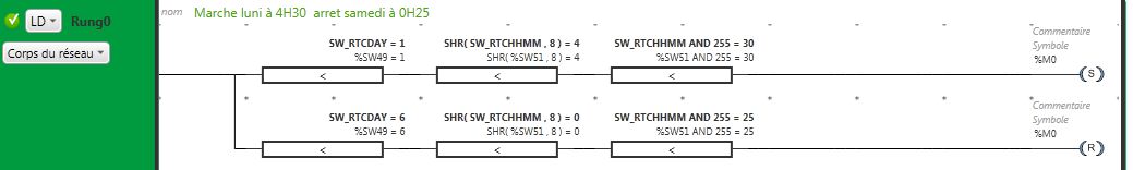 Alors, mon client souhaite que sa machine démarre et s'arrête automatiquement à une heure choisie sur un IHM, par exemple pour le démarrage, il choisit lundi à 04h00 et l'arrêt le samedi à 00h00.