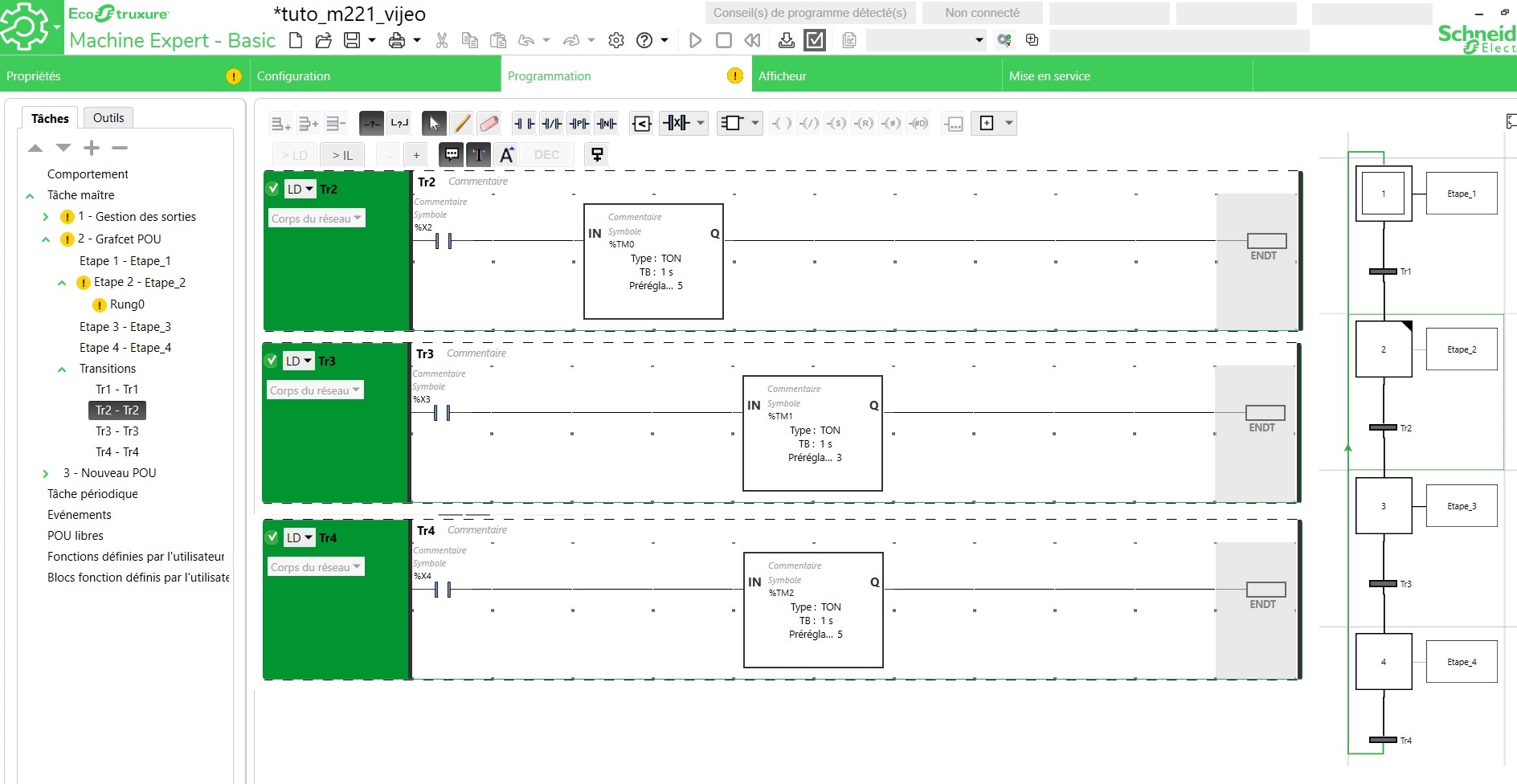 sinon pour ton Grafcet il faut pas mettre les tempos dans les transitions, réfléchis si l'étape n'est plus scrutée la tempo se fige dans sont dernier état.
