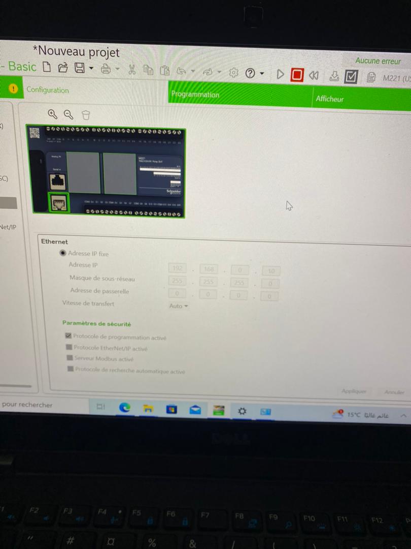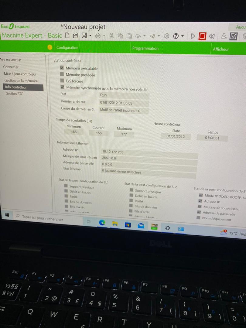 j'ai créer un projet pour M221 avec ecostruxure basic; j'ai configuré le port ethernet en lui donnant une adresse IP FIXE, j'ai ensuite chargé la configuration avec un câble USB, quand je vérifie les paramètre en ligne de ma CPU je trouve que mon automate n'a pas pris en considération l'adresse IP que j'ai donné mais garde toujours l'adresse IP par défaut (déduite de son m@c), sachant que même le ping ne passe pas entre PC et CPU pour le même sous réseau manuel alors qu'il passe normalement avec le sous réseau de l'adresse IP déduite