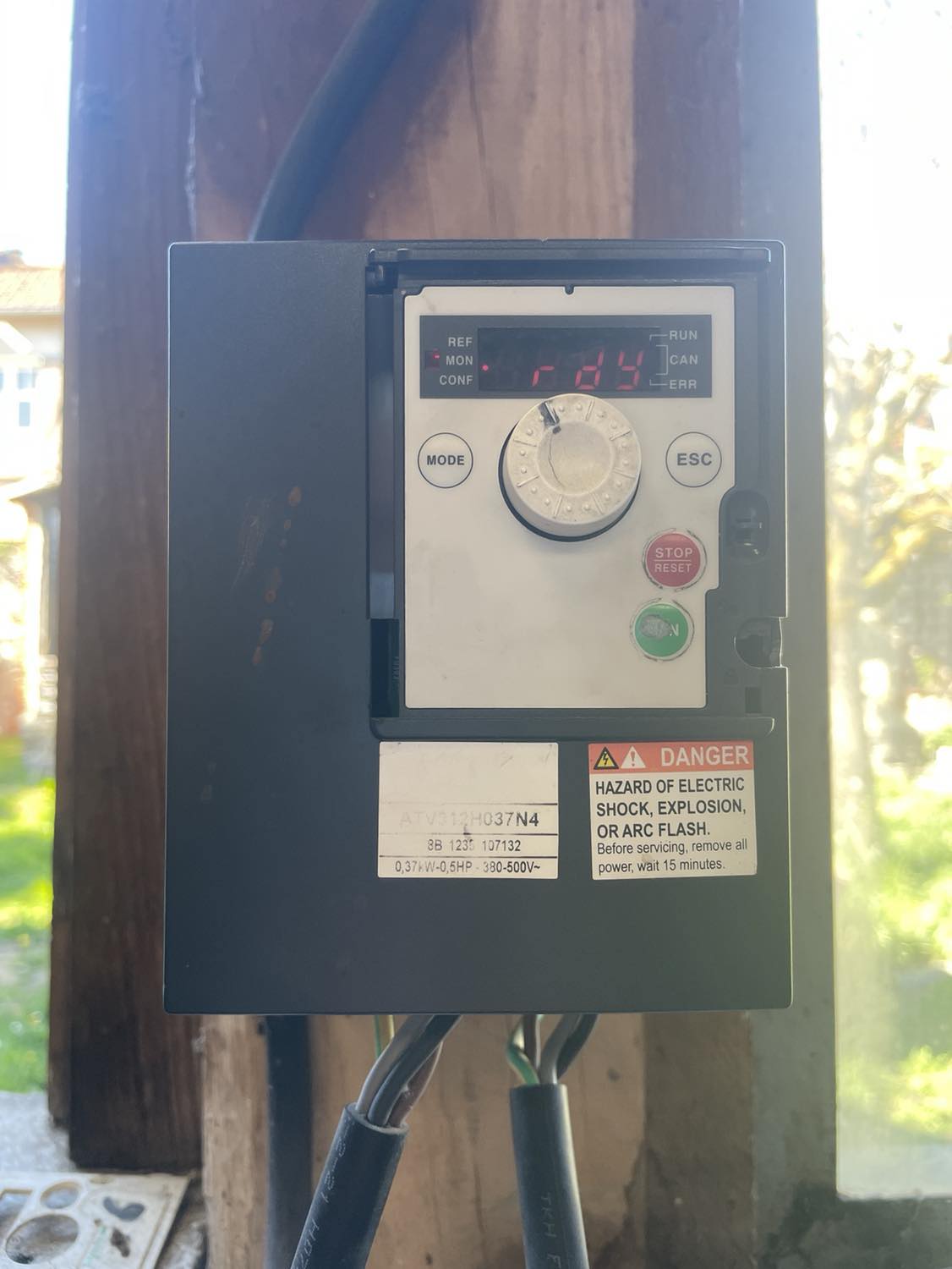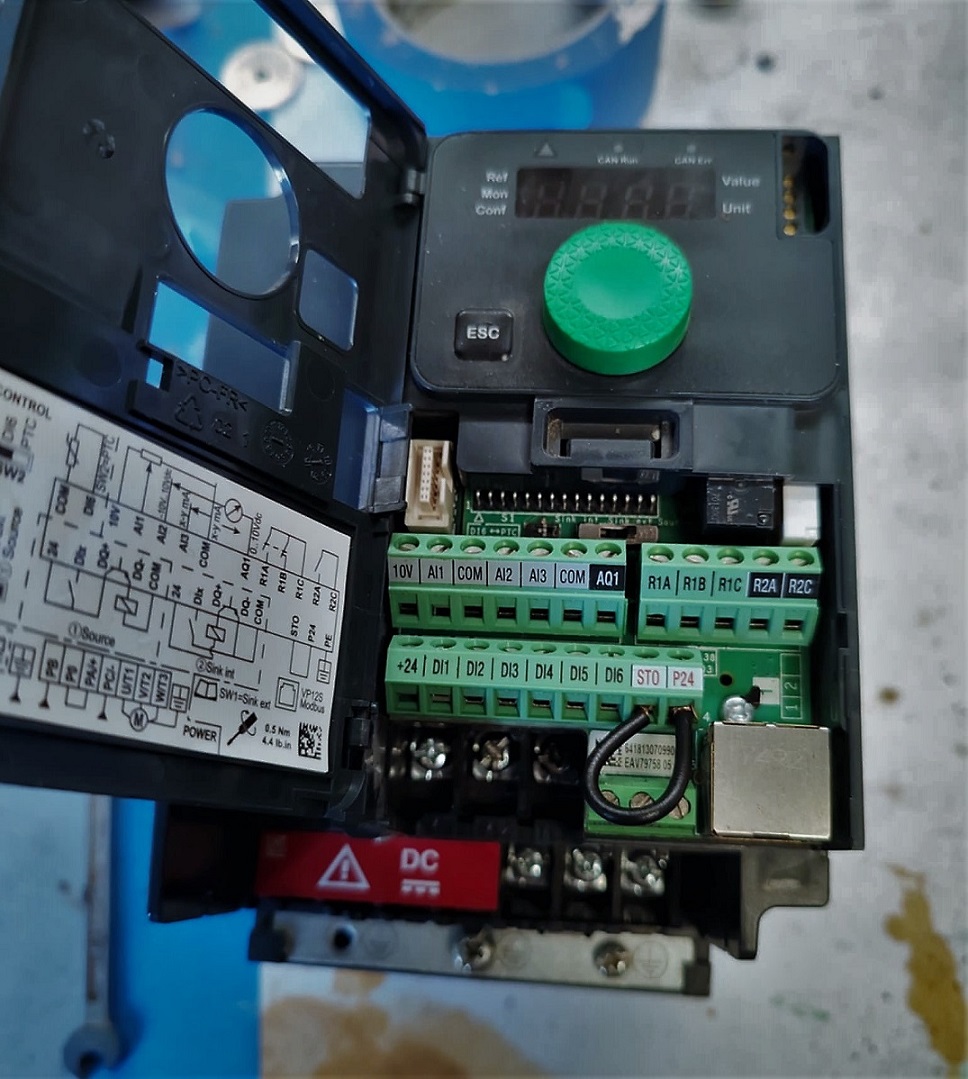 Le ATV 312, devenu monovitesse: Sauf que c'est du matériel d'occasion et qu'un jour, la molette n'a plus fait son effet. Plus possible de rentrer dans les menus et surtout de faire varier quoique cela soit. J'ai donc fouillé LBC en cherchant bêtement un variateur à la puissance correspondante à ma perceuse et surtout cette chouette molette. J'achète donc un Altivar 320. Et là, plus de bouton marche et arrêt. Je n'avais même pas fait attention.