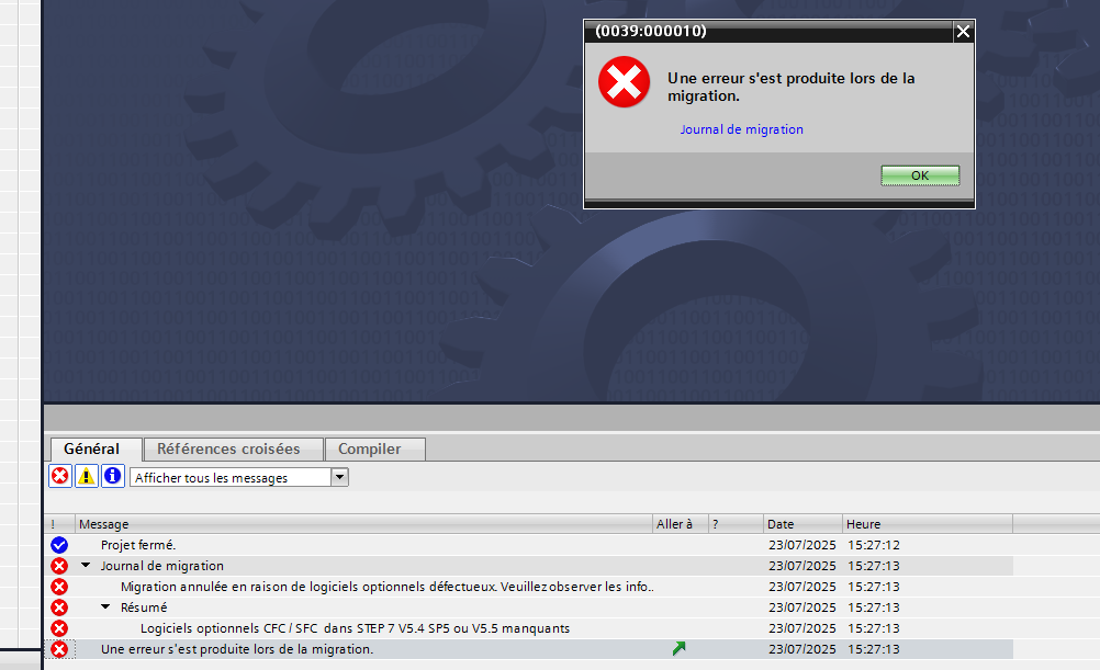 Mais la migration ne se lance même pas. Il me manque un "logiciel optionnel CFC/SFC dans Step7 v5.4 ou v5.5"