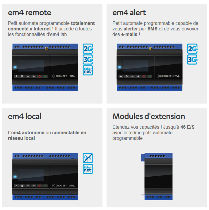 Téléchargement de em4 soft :Crouzet a écrit :Dans em4 lab, vous pouvez trouver tout ce dont vous avez besoin pour automatiser votre application dans les meilleures conditions.