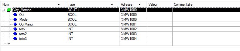 Comme on peut le voir dans l'exemple ci dessous j'ai mis l'adresse %MW1000 à ma variable "Voy_Marche", du coup j'ai 5 mots d'utiliser.