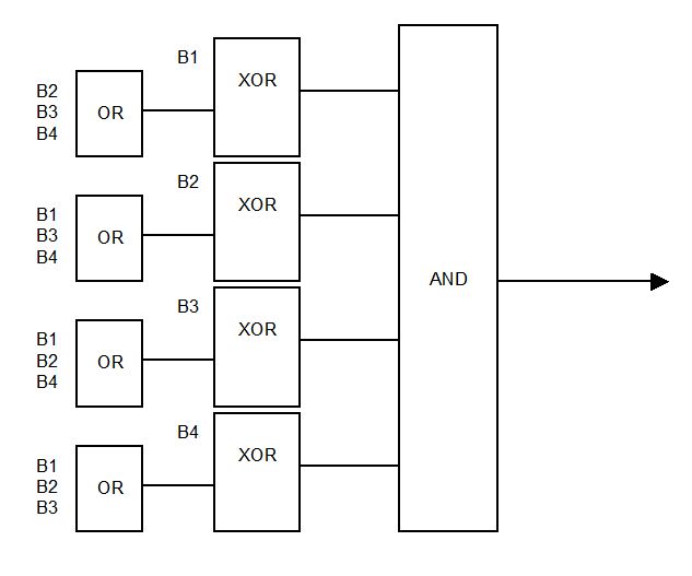 SORTIE= (B1 XOR (B2 + B3 + B4)) AND (B2 XOR (B1 + B3 + B4)) AND (B3 XOR (B1 + B2 + B4)) AND (B4 XOR (B1 + B2 + B3))