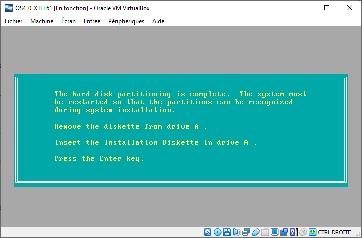 Quitte FDISK en appuyant sur F3 et en sauvegardant les modifications. - Il te demande de redémarrer, insère "Installation.img" et presse "Entrée"