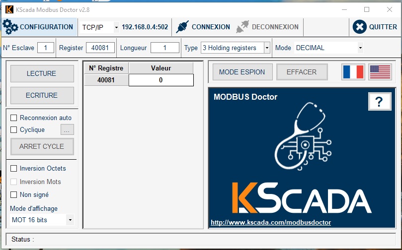 Pour ce qui est du registre renseigné dans Modbus Doctor, j'ai tout essayé 80, 81, 481, 4081, 40081, 400081, rien ne marche.