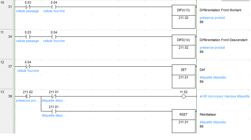 Une cellule (normalement allumée nf) contrôle le passage des produits qui sont acheminés par convoyeur, l'étiqueteuse déroule qu'il y ait ou non des étiquettes, pas de renvoi de défaut non plus ça continue. Il y a une cellule (allumée au repos nf), qui arrête le déroulage des étiquettes quand celle-ci se rallume.