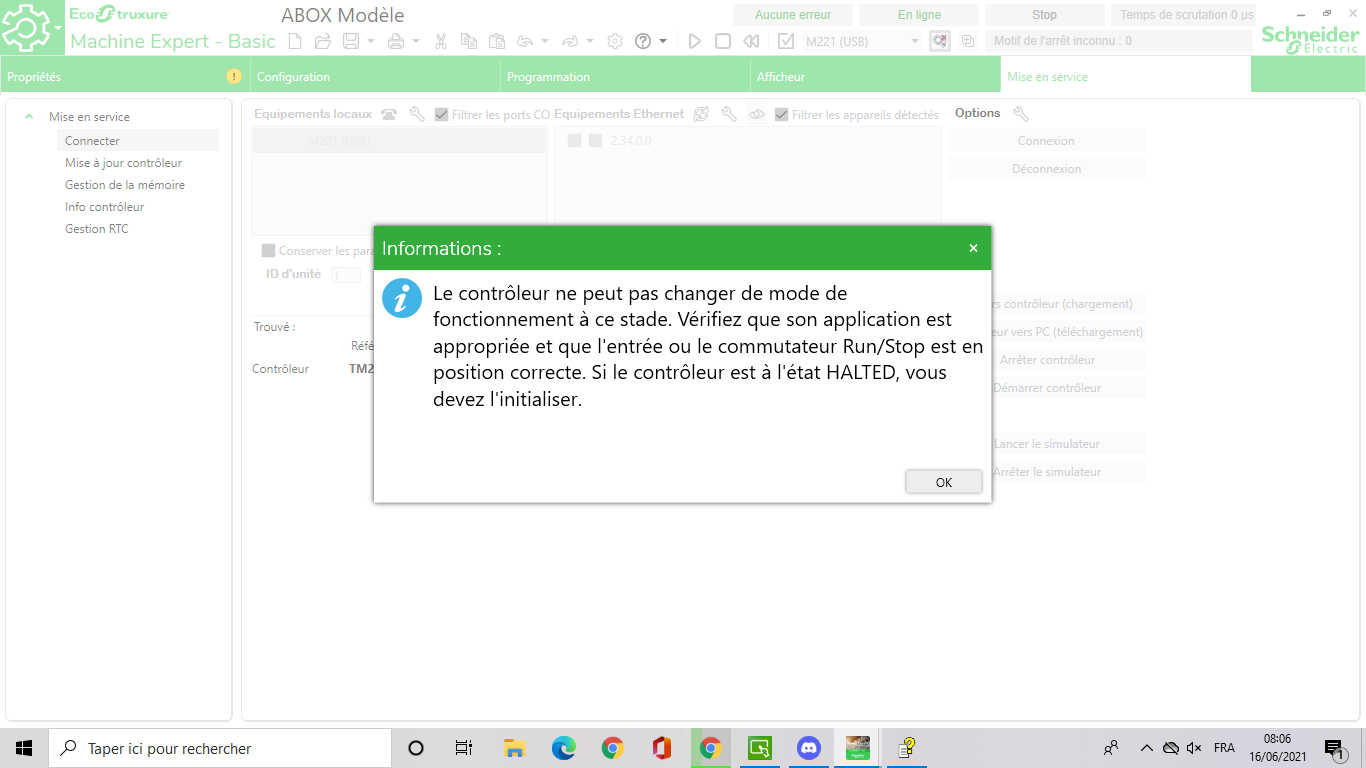 Le contrôleur ne peut pas changer de fonctionnement à ce stade. Vérifiez que son application est appropriée et que l'entrée ou le commutateur Run/Stop est en position correcte. Si le contrôleur est à l'état HALTED, vous devez l'initialiser