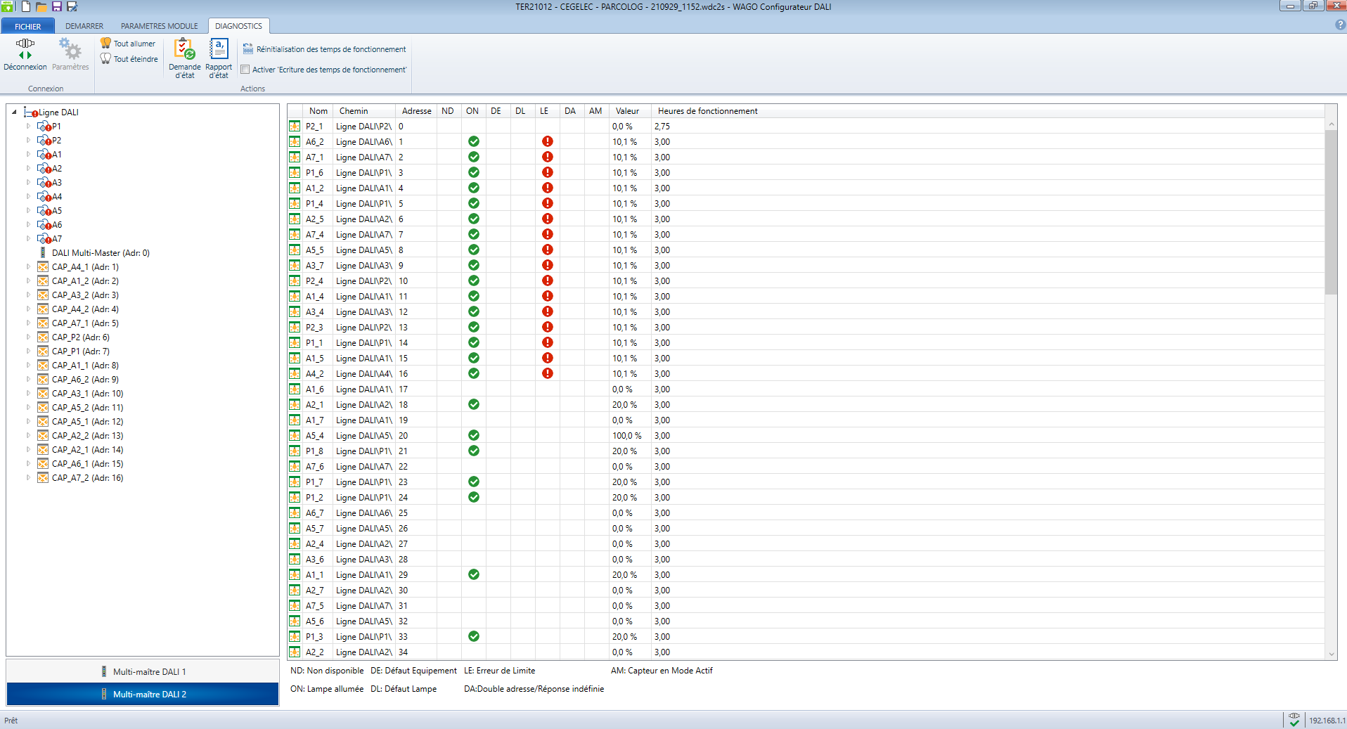 Via le logiciel DALI Configurator, j'ai bien pu identifier tous mes luminaires et capteurs présents sur chacun des bus. J'ai importé ma configuration dans e!Cockpit, mon programme sur le PFC tourne correctement, les pages de visu s'affiche bien.