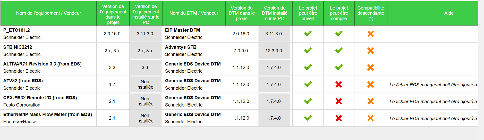 Mais il faut que le DTM résultant ait le même nom ("EtherNet/IP Mass Flow Meter (from EDS)") et la même version (2.1).