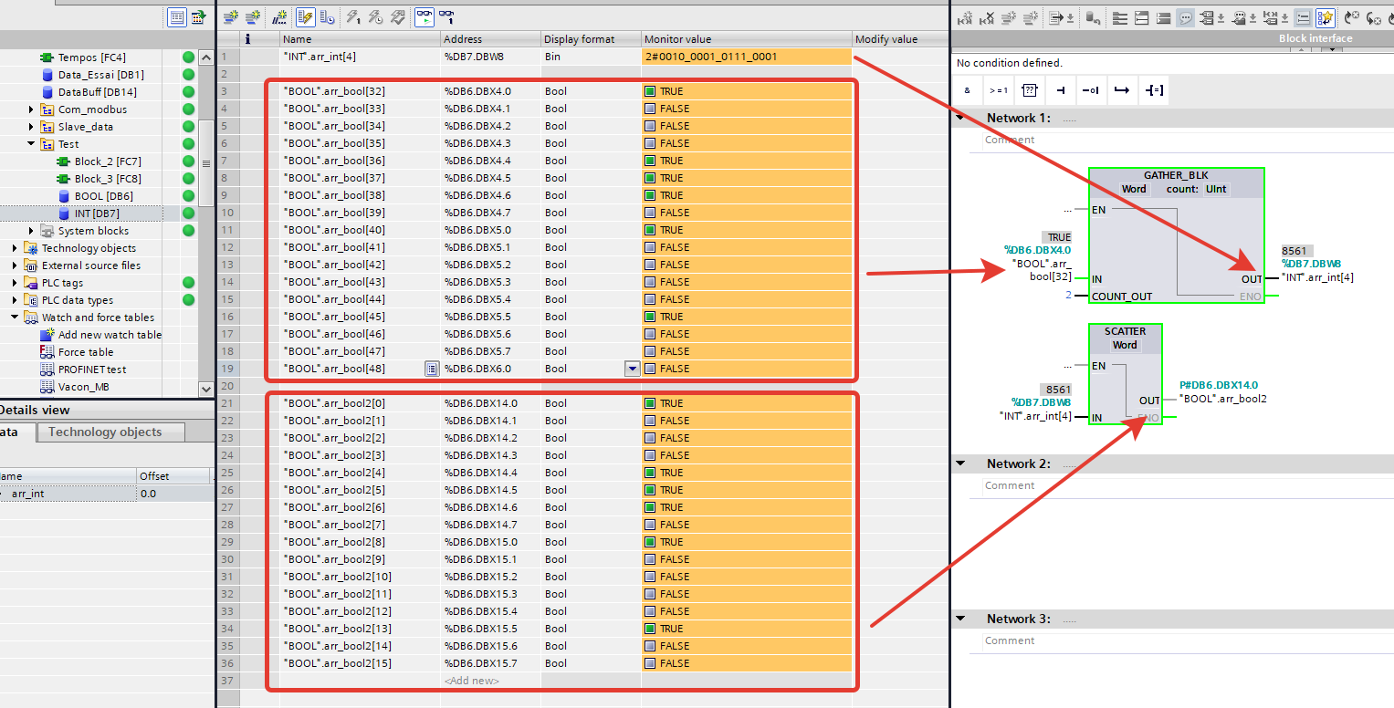 Ce que je cherche a faire c'est pouvoir transférer les valeurs de 32 bool a partir du byte 4 (donc 32 bool a partir du 32eme bool) du DB24 dans 2 INT a partir du byte 16 (donc vers le 8eme INT sur 2 int) du DB16. Ce qui fait 32 bit pour 32 bit donc ça colle.