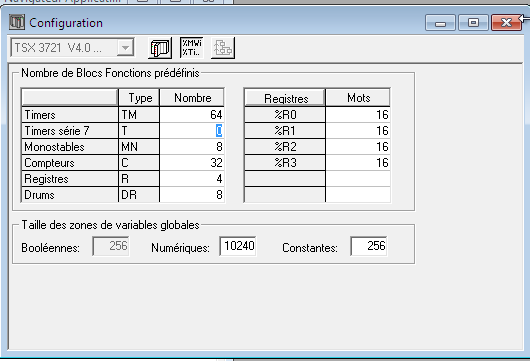 Bonsoir, s'il vous plait j'ai un problème avec le logiciel PL7 pro au niveau de configuration de logiciel : je veux utiliser " timer serie 7 " mais j'ai pas pu car dans la configuration logicielle le nombre de " timer série 7 " est 0. Comment je peut changer ce nombre à 64 ?