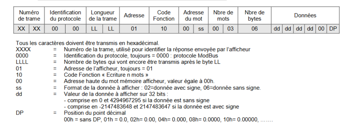 b) Structure du message envoyé à l'afficheur – Fonction 10h – mode Word