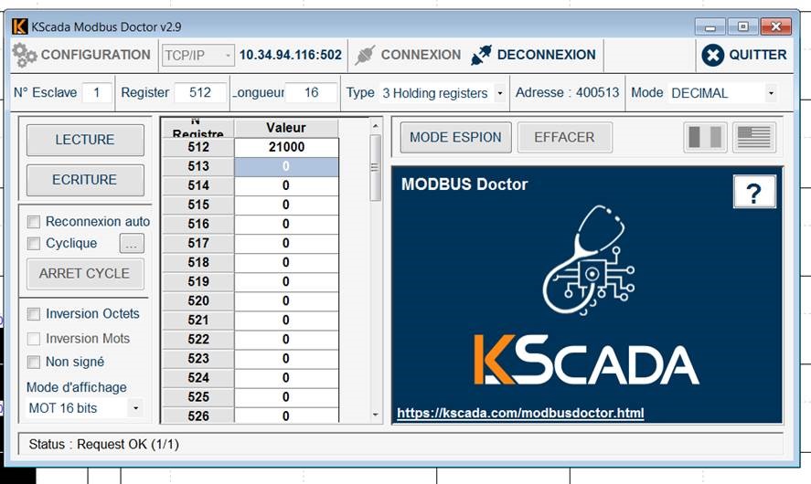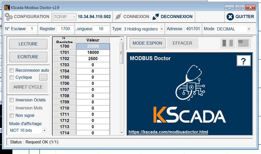 Modbus Doctor semble indiquer que l'adresse Modbus 1 fonctionne donc :