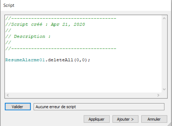 Peu importe ce que je note dans le script j'ai soit un problème avec le nom de mon affichage d'alarmes ou un problème avec le "deleteAll".