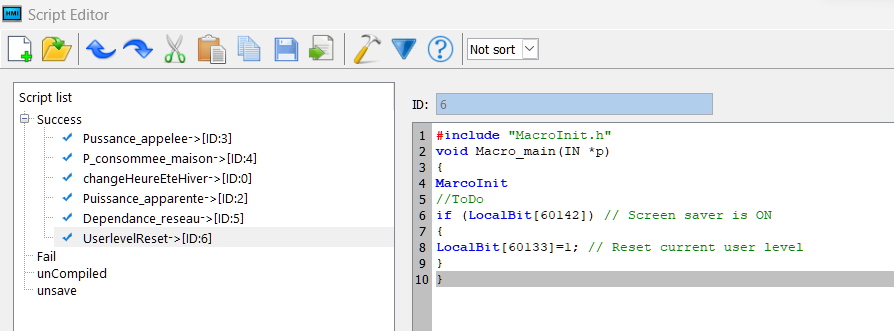 J'ai récupérer ces quelques lignes pour en fait changer de niveau utilisateur lorsque l'écran passe en veille ! ça marche nickel sauf que je voudrais pouvoir autoriser ou pas ce changement de niveau d’accès. J'ai déclarer un bouton avec un Localbit mais je n'arrive pas à l'inclure dans le script, toujours une erreur !