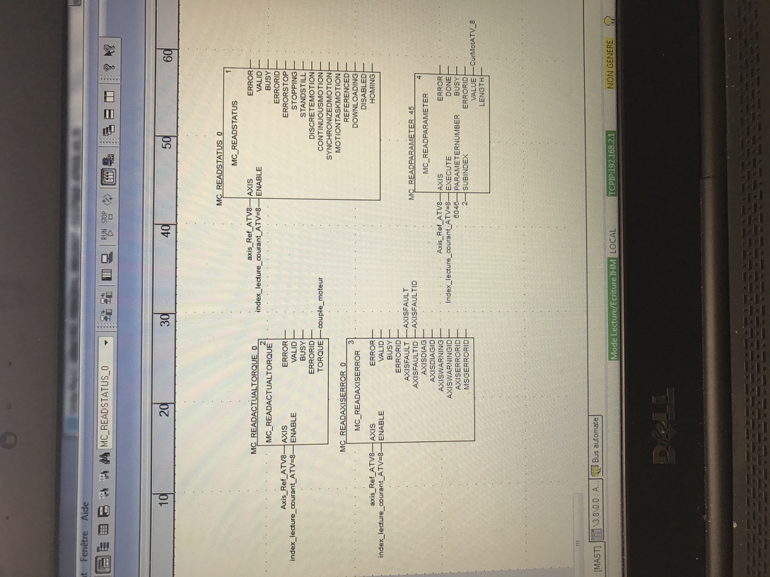 Le matériel utilisé est automate M340 et des variateurs ATV31 et ATV32 , mon soucis et que je dois faire remonter les informations comme les défauts (surtension , surcharges moteur etc ... ) ainsi que d'autres informations comme le courant actuel , le couple du moteur etc ... Mais je n'arrive à afficher que le couple . J'ai vu sur quelques documentations que l'on devait utiliser les blocs de fonction ( FFB ) comme le bloc MC_READSTATUS .