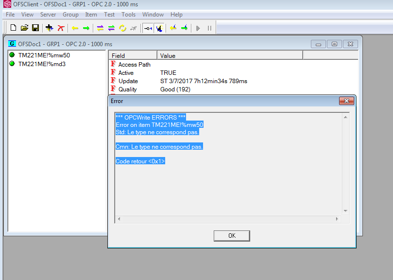J'ai essayé d'utiliser le client de test OFS pour ecrire un caractere (exemple : a) dans l'@ MW50 mais ça ne marche pas