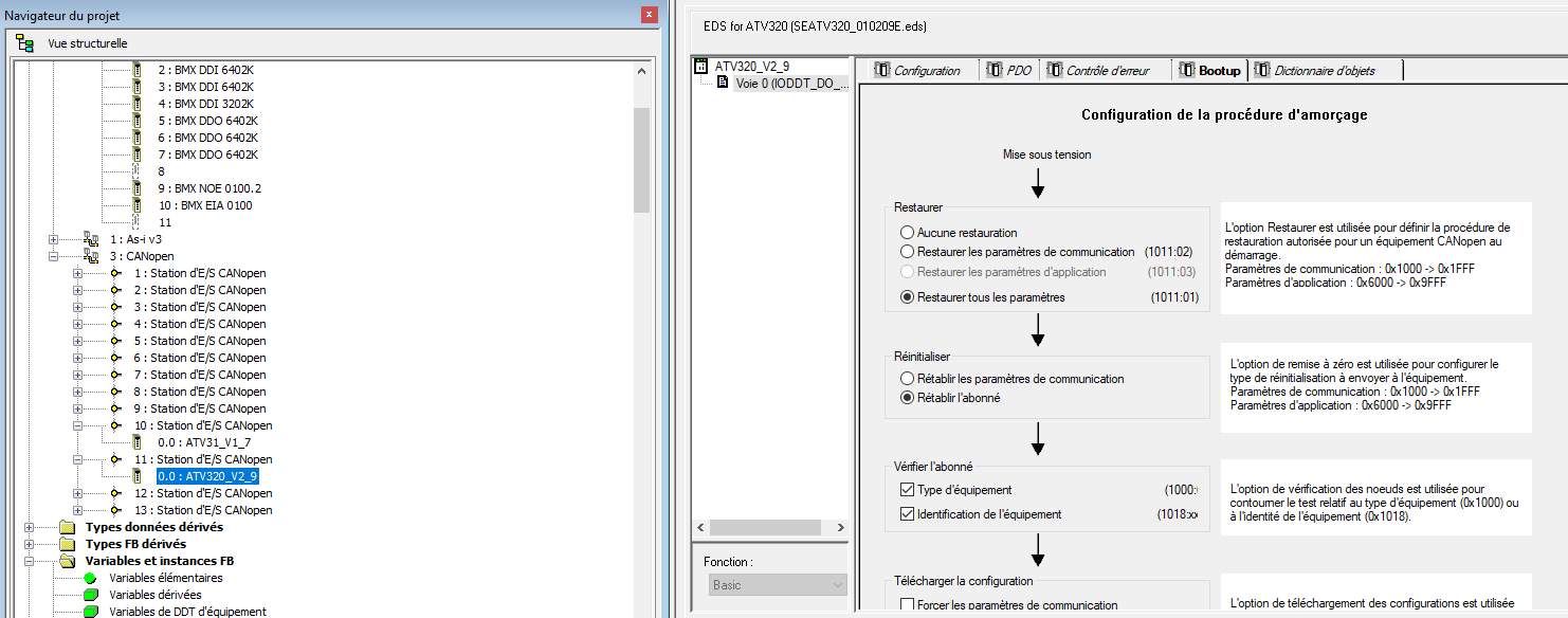 Le problème c'est que si je coche la case "aucune restauration" ce qui est le cas pour les ATV31, dès que je pilote un des nouveaux variateurs ATV320 je plante l'ensemble du réseau alors que si la case "restaurer tous les paramètres" est cochée j'arrive a faire fonctionner tous le monde ensemble sans plantage de réseau...