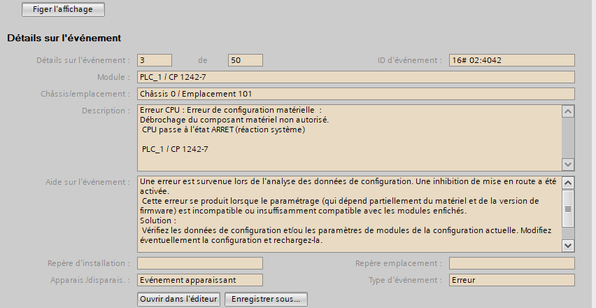 Pour info, il y a un OB spécifique à inclure dans le projet afin de ne pas mettre la CPU en stop et de gérer ce genre d’événement.