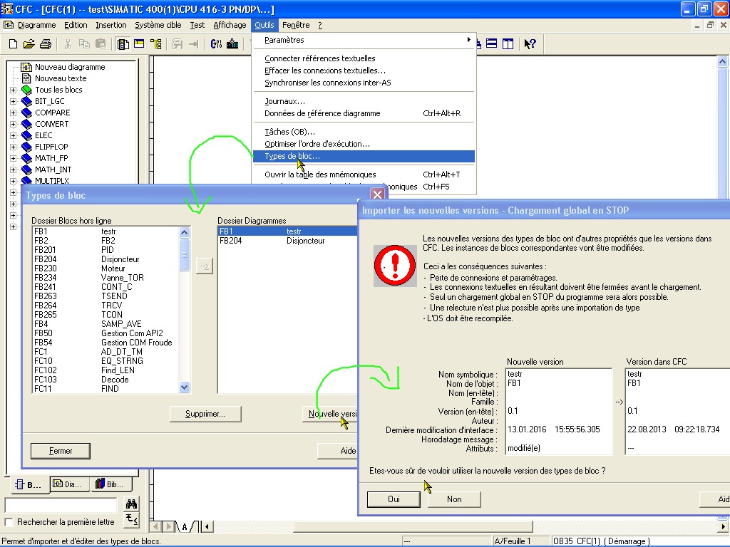 Oui sinon la solution "SIEMENS" c'est passer par le menu "Outils" de CFC et "type de blocs", pour mettre à niveau les blocs du dossiers diagrammes.