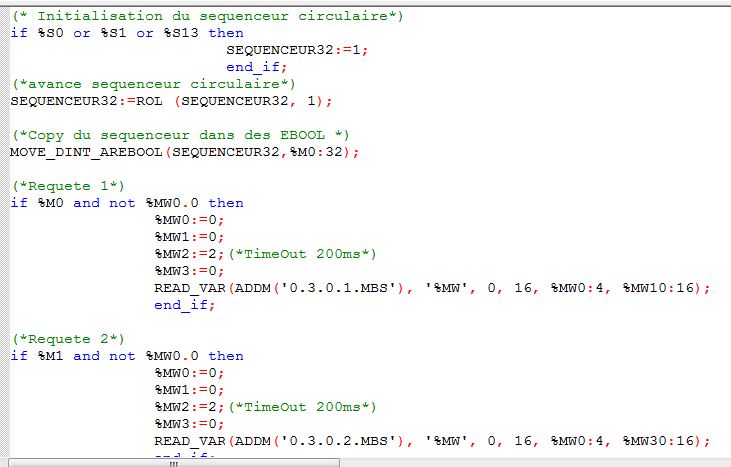 Pour ne faire qu’une seule requête par tour de cycle, dans la principe on peut faire toutes les requêtes dans le même tour de cycle car ça bufférise, sauf que si le Buffer est plein, ça bloque la COM. Normalement avec le TimeOut + le bit d’activité ça ne doit pas arriver, mais comme tout ce qui ne doit pas arriver arrive, après pour la débloquer il faut venir avec un vérin hydraulique pour la désincarcérer,