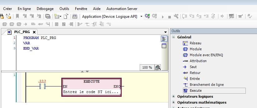 L'avantage par rapport à un bloc Opération est qu'il n'y à pas de limitation à la longueur du code ST que l'on peut écrire dans ce bloc.