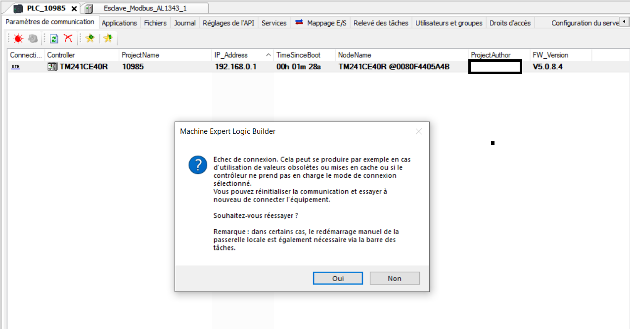 J'ai déjà réussi à me connecter à d'autres M241 en juin sans soucis et je n'ai pas eu fait de modification de mes logiciels depuis.