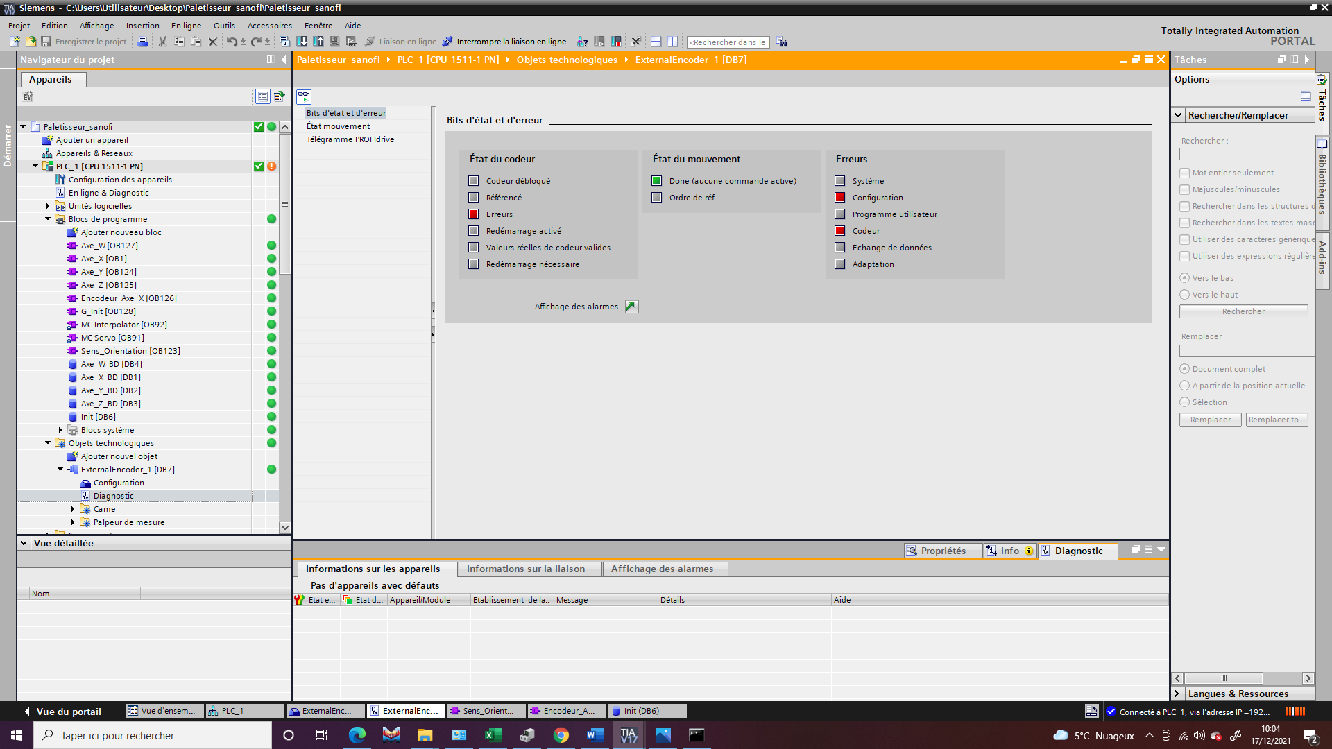 Je programme sur TIA portal et j'utilise l'objet technologique "ExtrnalEncoder" mais je n'arrive pas a récupérer la positon de mes axes. Sur l'mage ci-dessous vous verrez les erreurs affichées.