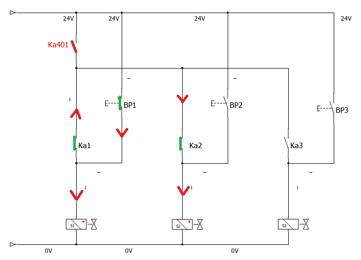 Mais en l'état, ça ne fonctionne pas: dans le cas ou Ka401 est désactivé, ou plusieurs relais automates sont activés, et ou on active l'un des actionneurs manuels correspondant, la circulation du courant provoque la mise sous tension de toutes les sorties dont le relai automate est activé