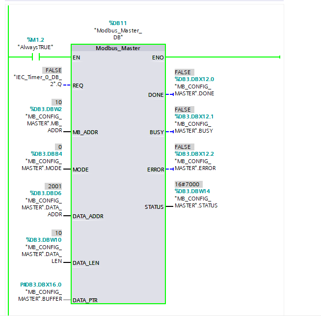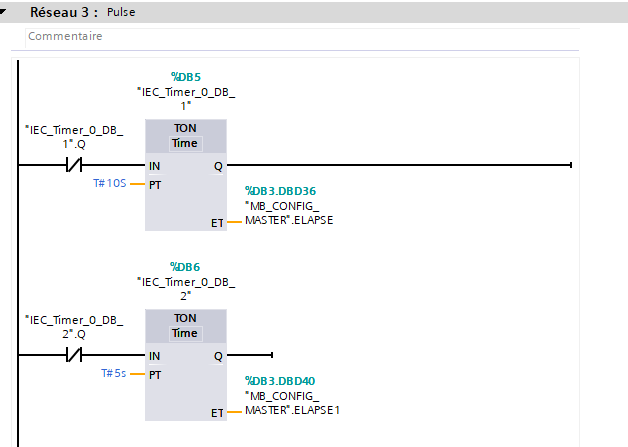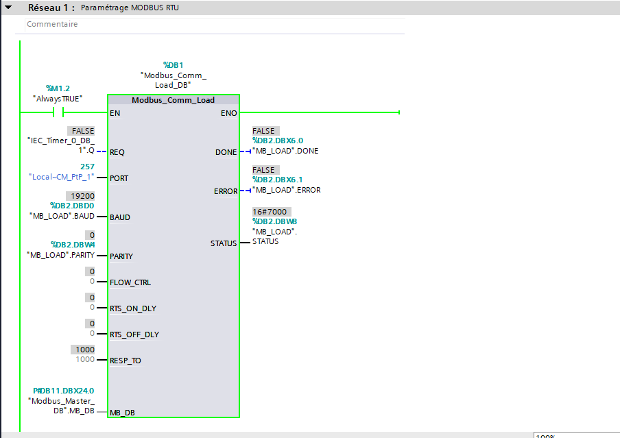 Je rencontre un problème depuis plusieurs jours, j'essaye d'établir une communication entre une centrale de détection et un automate Siemens. Je n'ai pas d'erreur sur mes blocs Modbus_Comm_Load et Modbus_Master. Le PORT et les informations de connexion sont correctement insérées, mais lorsque j'essaye d'obtenir des informations, je n'ai absolument rien, aucune led Tx ou Rx est allumée des 2 côtés.