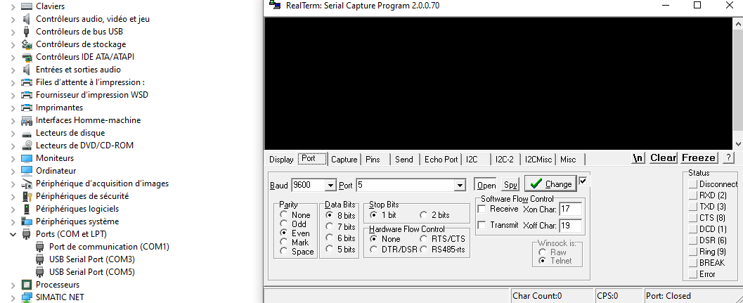 Dés que je commence à capturer avec RealTerm, je fais des tests RUN/STOP avec ma CPU, la led TX fonctionne et pourtant je capture rien du tout, donc j'en conclus qu'il n'y a pas de communication, je ne sais pas d'où cela peut venir sachant que mon PORT dans le bloc "Comm_Load" est bien configuré avec le module de communication "CM_PtP".
